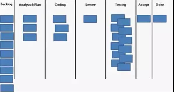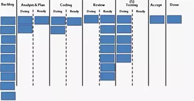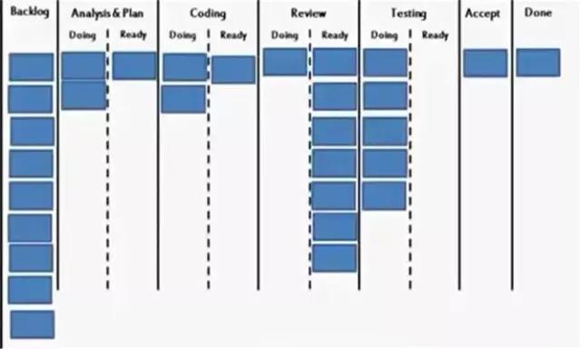 如上图,大量工作堆积在Review Ready,等待测试开始。而测试Done这一列没有卡片; Accept列只有一个卡片,因为大部分没有流入Accept。从而,可以判断测试环节为整个价值流的瓶颈。
