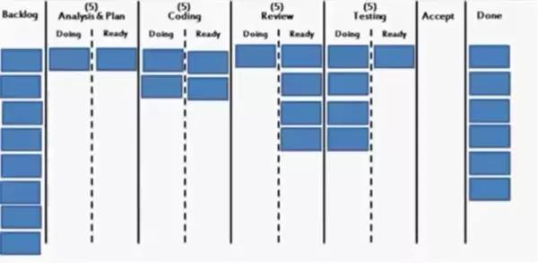 只有把每个环节精细可视化,看出这些堆积的工作到底是正在进行中,还是已经完成而是由于下游没有人力拉动。所以看板里的每个环节都细化为进行中、完成两列。像下图: