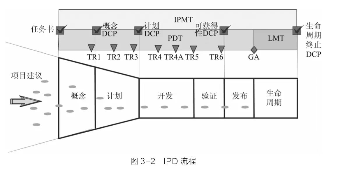 IPD流程在产品上市前建立了概念决策评审点(CDCP)、计划决策评审点(PDCP)、可获得性决策评审点(ADCP)三个投资决策评审点,分别决策能否进入下一个阶段,并批准相应阶段的投资,形成了分阶段投资的模型,以控制研发投资风险、减少研发投资浪费。这些决策点不是技术评审,而 是商业评审,关注正在开发过程中的产品在将来市场中的地位和竞争力,是否值得投资,有无清晰的开发计划,上市前产品及各功能领域是否准备就绪等。