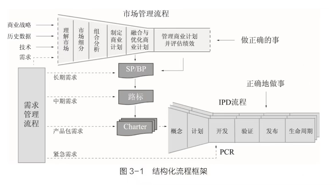 市场管理流程保证做正确的事,选择正确的市场机会和把握产品投资机会;IPD 流程确保正确地做事,使得产品开发的过程规范、高效、产品质量有保障;需求管理 流程聚焦需求确认与实现,保障开发的产品与解决方案是满足客户需求的。三大流程 充分体现了市场驱动、客户需求导向和把产品开发作为投资来管理的思想。市场管理流程、IPD 流程以及需求管理流程,构成了 IPD 结构化流程的核心框架。