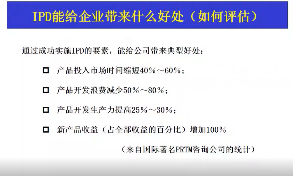 投资组合和市场管理通过引入IPD来确保企业做的事情是正确的,从而将有限的资源投入到最值得投入的产品中;研发通过引入IPD,来确保企业采用了正确的方式做事,从而确保研发过程有序,减少返工和浪费。