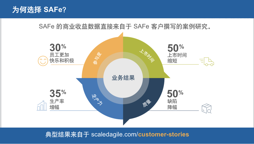 王明兰:SAI官网(https://scaledagile.com/insights-customer-stories/)披露在全球范围内的案例证实,SAFe在以下方面对企业已经证实有效:员工敬业度提升10-50%;产品上市速度缩短王明兰:;生产率提升20-50%;质量提升25-75%。