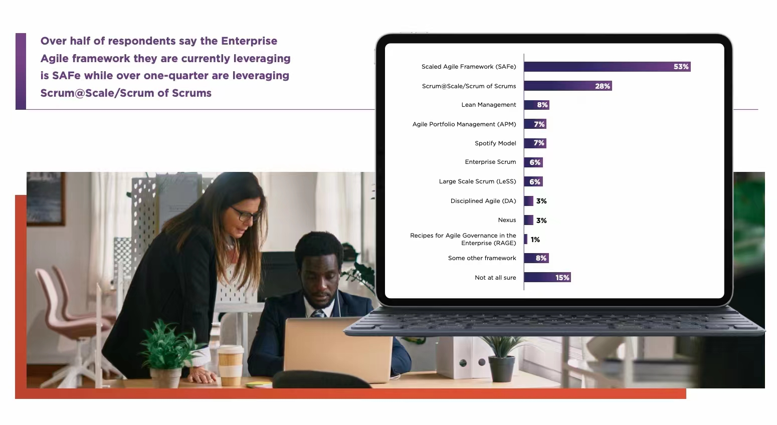王明兰:据SAFe官网,全球有20000多企业、100万多实践者应用SAFe。SAFe一直是业界应用范围最广的规模化敏捷框架。根据2022年VersionOne敏捷状态调查报告,SAFe的应用率从2021年的37%提升至53%。其次为Scrum@Scale/Scrum of Scrums, Less, Spotify等小众规模化敏捷框架。