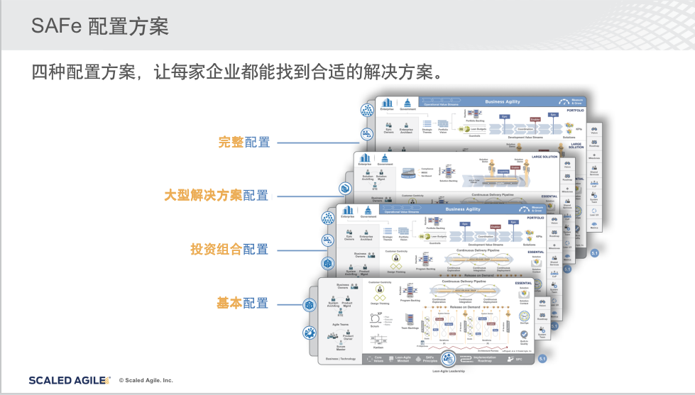王明兰:SAFe有四种配置:基本配置、大型解决方案配置、投资组合配置、完整配置。每个企业根据自身的规模和需要可以定制好选择相应的配置。如果您公司的产品涉及的人数30人-100人之间,选择基本配置足以;如果想应用精益敏捷的理念实现合理的产品投资规划,可以应用SAFe投资组合管理配置;如果像您公司的产品形态非常庞大,涉及的人数达几百人甚至上千人,则需要大型解决方案配置。