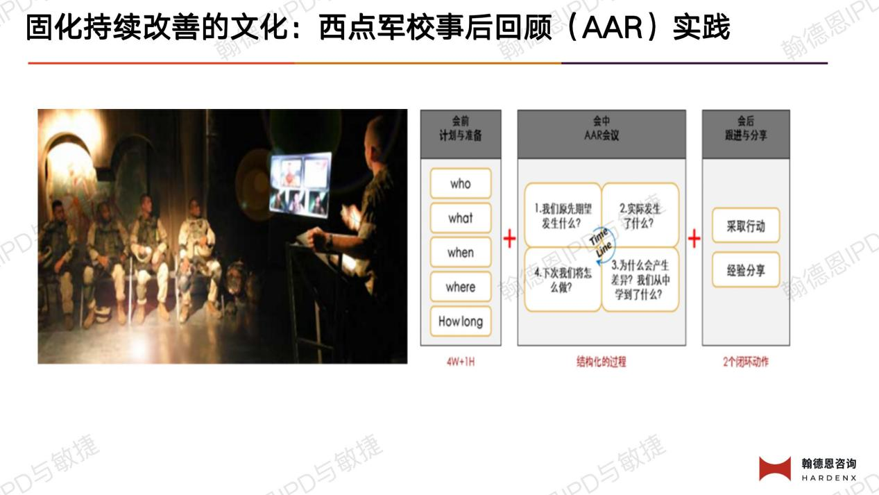 她也分享了华为公司采用西点军校复盘AAR(After Action Review:任务后检视 )的实践,强调了小步PDCA与持续复盘的重要性,指出这是提升个人与团队竞争力的关键所在。
