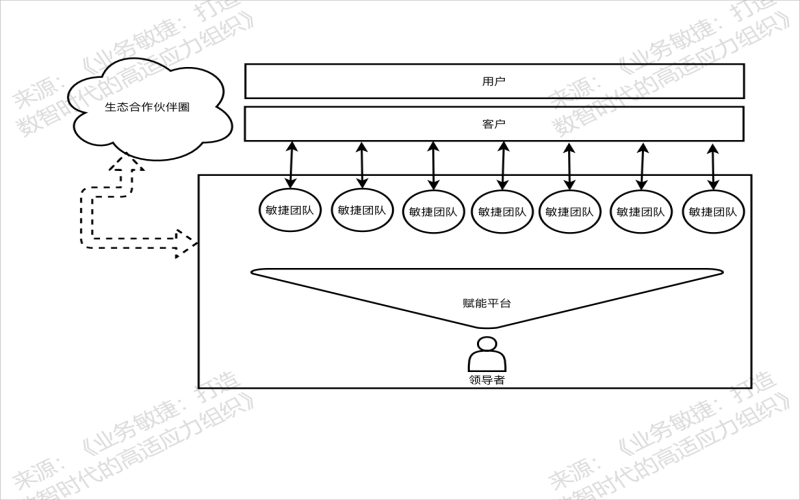 采用敏捷团队 + 赋能平台这样的组织设计模型,能够将职能型组织重构为小的、独立的、对产品价值链端到端负责的敏捷团队,敏捷团队直接面向客户,可满足组织快速响应业务变化、灵活创新、快速交付的要求。同时,赋能平台为敏捷团队长期服务,既满足了组织复用公共资源,又避免了各自为政、重复建设而产生的效率低下和浪费,从而提升了整个组织的运营效率。因此,业务敏捷组织模型既满足组织对外界的适应性要求,也满足组织追求效率的要求。