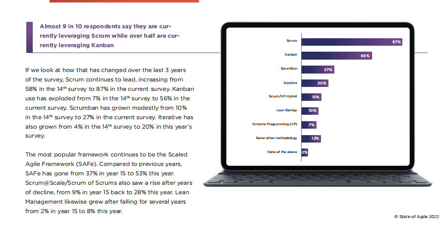 据最新出炉的VersionOne 2022年(第16届)全球敏捷状态调查报告, 看板应用率从第14次调查的7%激增至56%。