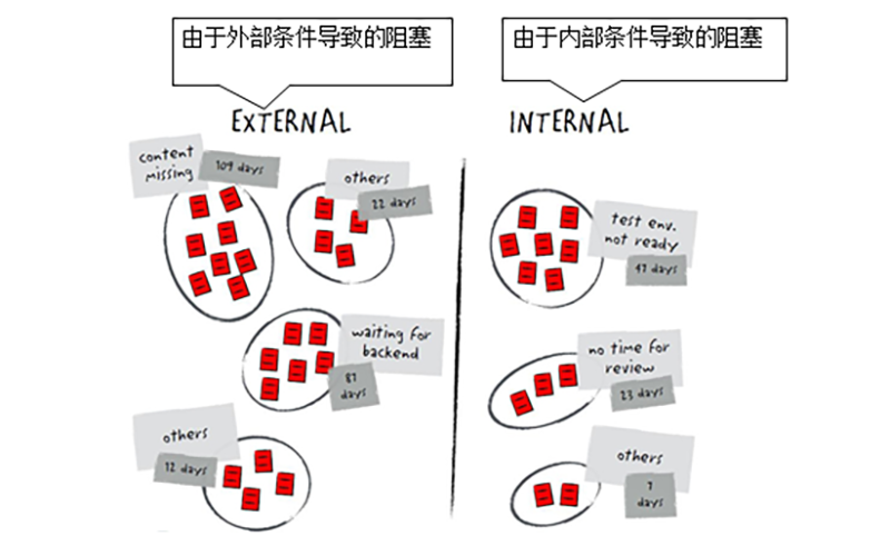 一个国外咨询案例,在交付评审会议上,团队将一段时间以来的阻塞卡集中到一起并分类。阻塞卡分成了两大类:由于外部条件造成的阻塞和由于内部条件造成的阻塞。每个大类又依据阻塞原因分了几个阻塞模式。分类后,团队就阻塞卡最多的几个模式讨论:为什么这么多阻塞问题聚集为一个模式?它们的根本原因是什么?怎么做才能从根本上预防这类模式的阻塞?