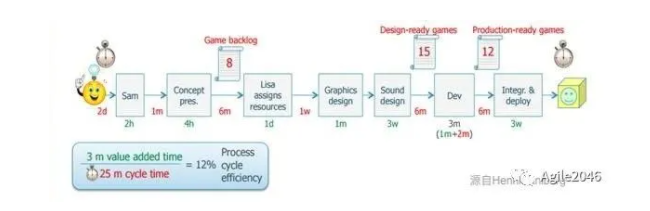 下图是某网络游戏公司,从一个创意提出来,到上线给用户使用的整个TTM(Time To Market)周期的价值流映射。